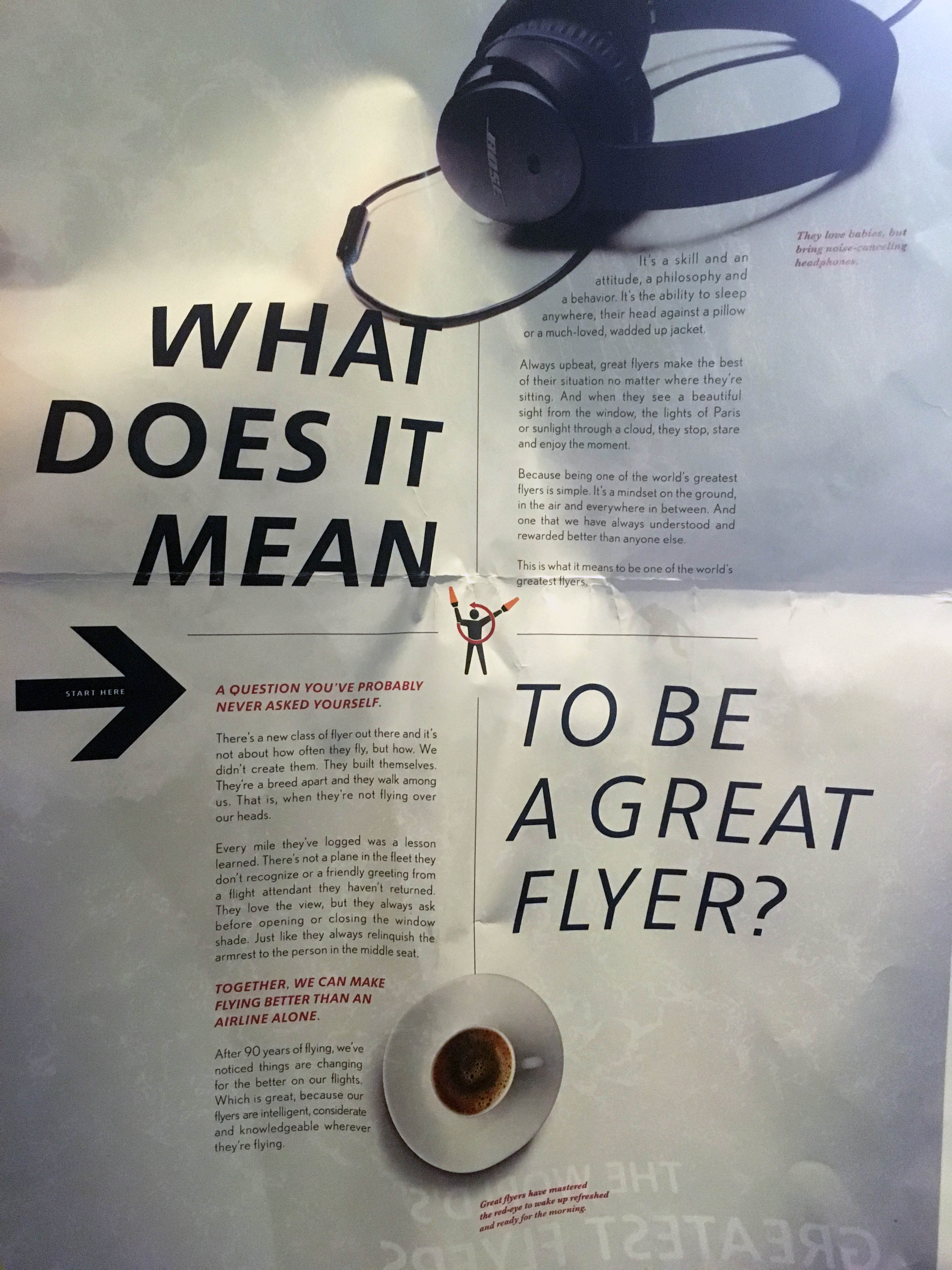 The copy-dense ad includes references to babies, red-eyes, noise, middle seats, lessons learned, 'relinquish', making the best of the situation and the ability to sleep anywhere. All told in an odd third-person, referring to the hero as "they" not "you."